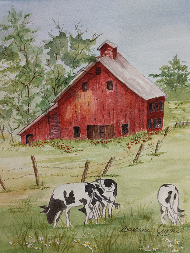 Red Barn came into inception when a friend wanted a wedding gift. She said "Black and white cows, a red barn with wild flowers". It is a watercolor and sized to 8x10. Any other size could be done as well.
