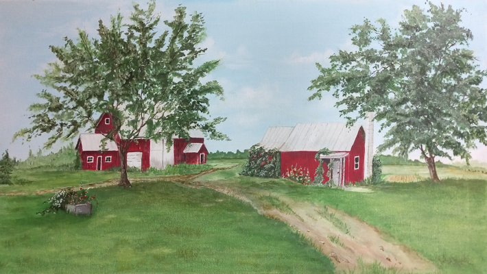 Home is probably the most meaningful painting(s) I have ever done. I grew up on a farm and these are some of the farm buildings on the property. I painted two paintings in oils on wide narrow canvases. I used two photos to copy the buildings. Between the buildings you see a two-track road that goes back to the woods. Father owned a lot of property and we had free reign to play, mushroom pick, flower hunt and ride dirt bikes. This is sort of what it looks like today, many years later! Wouldn't you like your childhood home painted?