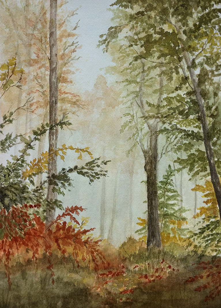 Misty Woods was painted using watercolors and is about 10x16 in size. It can be painted in any size you wish and priced accordingly.