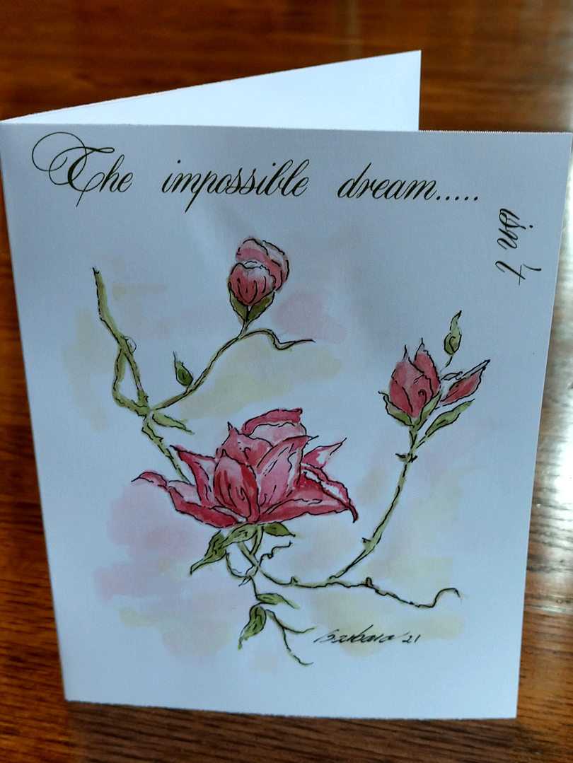 This small painting is done on card stock 5 1/2 inches by 4 1/4 inches and comes with an envelope. The text has been printed but the watercolor artwork is mine. Inside of card is blank. Many of my paintings can be done in card stock and come with envelopes. You could request your own design and have no text so it would be framed or sent to that special person.