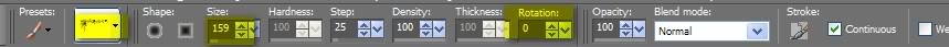 26. Set Brush Size to 159, Rotation 0. Stamp upper left corner with foreground color. (see example below for brush settings).