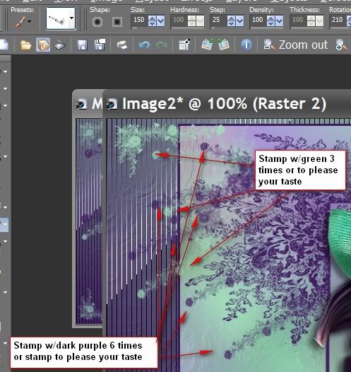 29. Set the Size to 150 and leave it for remainder of steps. You will change the Rotation only in the rest of the steps and stamp as in example below, stamping flowers into mask flowers. Do not try to be too exact or it will spoil your fun. Be creative and stamp differently than I have if you wish. Take "artistic license".