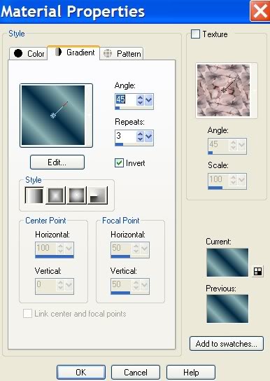 1. In Materials Palette set Foreground to #8eb3b4, Background to #002842. Under the Gradient tab, set the Style to Linear, Angle 45, Repeats 3, Invert checked.