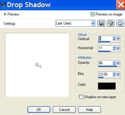 9. Effects/3-D Effects/Drop Shadow. Vertical 6, Horizontal 11, Opacity 86, Blur 23, color #000000.