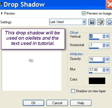 30. Effects/3-D Effects/Drop Shadow, Vertical -2, Horizontal -7, Opacity 76, Blur 17, color #000000.