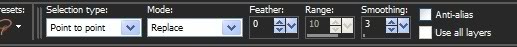 28. Move oeillets (eyelets) to the left over middle border stripe. Eliminate the three oeillets (eyelets) on the right by surrounding each one with Freehand Selection tool, press Delete key using settings as in example below. If you wish, you may use your Eraser tool to accomplish the same results.