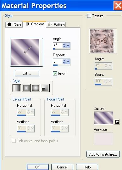 2. Click Gradient tab and set Gradient to Linear, Angle 45, Repeats 5, Invert checked.