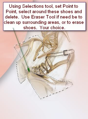 12. Using Selections Tool, select around the left and bottom shoes and click delete key. See example for erasing this way or use the Eraser tool carefully to eliminate the left side and bottom shoes.