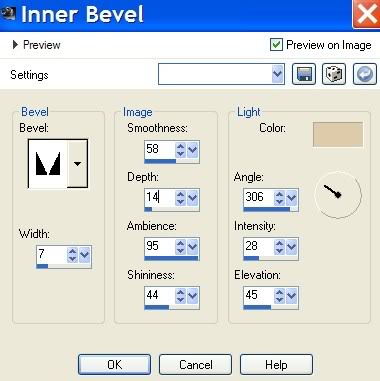13. Effects/3-D Effects/Inner Bevel. Use color #ddcba9 and settings below. Selections/Select None.