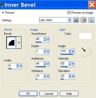 31. Effects/3-D Effects/Inner Bevel. Use same settings as in Step 26. Selections/Select None.