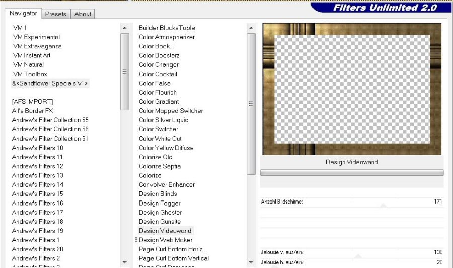 22. Activate Raster 5 (large border). Effects/Filters Unlimited/Sandflowers/DesignVideo Wand. Use settings as shown.