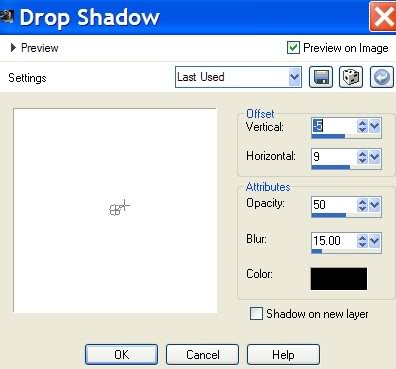 37. Effects/3D Effects/Drop Shadow, Vertical -5, Horizontal 9, Opacity 50, Blur 15, color #000000.