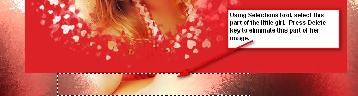 20. Using Selections tool, Mode set to Replace, select the section below the little girl that shows on Raster 1. Press Delete key. Selections/Select None. See example below.