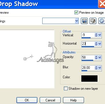 23. Effects/3D Effects/Drop Shadow, Vertical -9, Horizontal 23, Opacity 58, Blur 28, color #000000.
