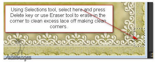 14. Making sure the bottom layer of border is highlighted and using Selections/Delete key, or Eraser tool, remove the lace in the corners so the green portion looks clean. Do this on both left and right sides of bottom layer.