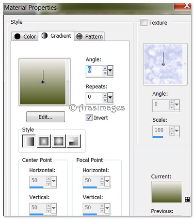 67. In Materials Palette, create a Gradient using foreground #f3f0ed, background #4c5418, Style Linear, Angle 0, Repeats 0, Invert checked. Flood fill the 25px border with this Gradient.