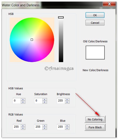 4. Click on the blue waves to set Motion Type to A. To change your settings for the way the ripples will appear (use example shown) then click on Water Color/Darkness. When the next box appears, select No Coloring. Click OK.