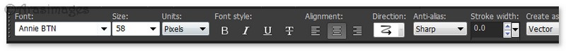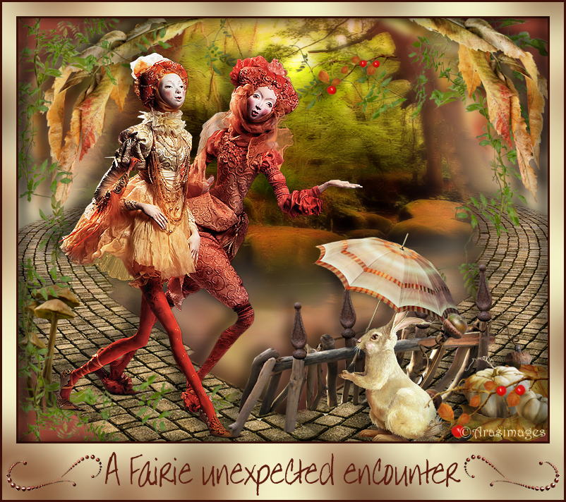 60. In Materials Palette, change Background color to #5c1c10. From Tool bar, select Text tool, Font Annie BTN, Size 58, Line Style Solid. Type out the words "A Fairie unexpected encounter". Convert to Raster Layer.