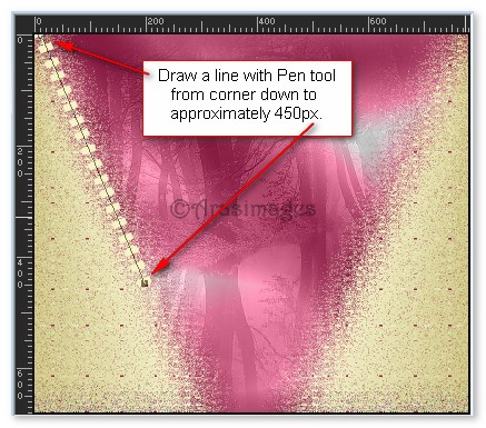20. From the Tool bar, select the Pen tool. Have the settings as seen below in examples 1 and 2 using Line Style Round End-Gaps. From near the top left corner of image, start drawing a line on an angle down to 450px, as seen in example. Convert to Raster Layer.