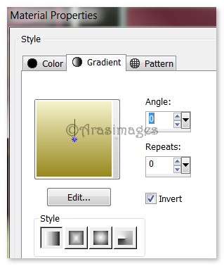 9. In Materials Palette, change Background to #988829. Create a Gradient using Foreground/Background colors, Style Linear, Angle 0, Repeats 0, Invert checked, all other settings not applicable.