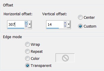 10. Effects/Image Effects/Offset. Horizontal Offset 307, Vertical offset 14. Custom and Transparent checked. Drop Opacity down to 48.