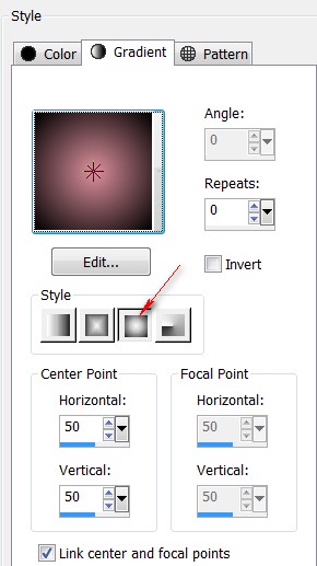 2. Create a Gradient using Style Sunburst, Angle 0, Repeats 0, Invert unchecked, Center Point Horizontal/Vertical at 50, Focal Points grayed out, and Link center and focal points checked.