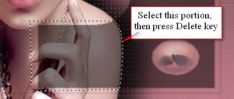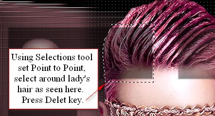 39. With Selection type set Point to point, Mode Replace, Feather at 0, Anti-alias checked, select around the portion of the lady's hair that is not showing under upper left shape. Press Delete key once. CTRL+D.