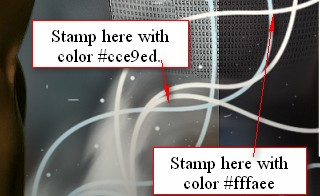 38. From Tool bar, select the Paint Brush tool. Select Ecol 5 brush from the dropdown, using size 600, right click where indicated using Background color #cce9ed where indicated. Using same Ecol 5 brush, size 600, left click where indicated in Foreground color #fffaee.
