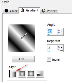 2. In Materials Palette, set to Gradient, Style Linear, Angle 45, Repeats 3, Invert unchecked, all other settings not applicable.