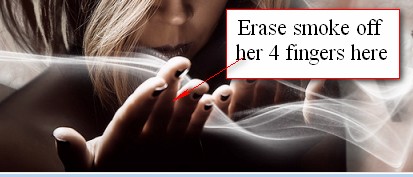 20. Using Eraser tool, set to size 16, all other settings at default, erase smoke from in front of her hand on the left.