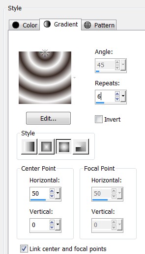 2. In Materials Palette, set to Gradient, Style Sunburst, Repeats 6, Invert unchecked. Center point: Horizontal 50/Vertical 0. Link center and focal points checked.