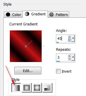 2. In Materials Palette, Gradient set to Style Linear, Angle 45, Repeats 3, Invert unchecked, Center Point and Focal Point grayed out.