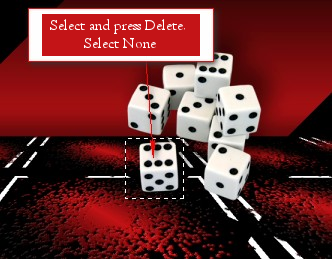 21. Using Selections tool set to rectangle, Feather 0, select around the bottom left die. Delete from cluster of dice.