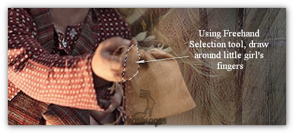 36. Scroll your working image larger to 200% so you can see better where to select. Using the Freehand Selection tool, Point to Point, Feather 0, draw around little girl's fingers. Press Delete key. CTRL+D.