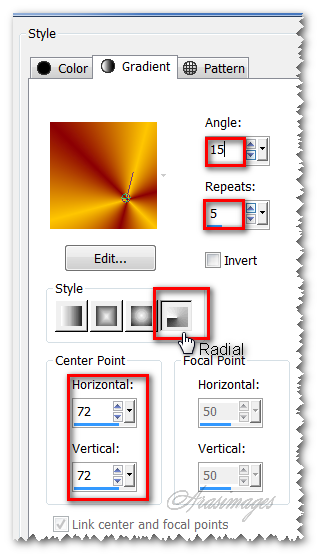 2. In Materials Palette, set to Gradient, Style Radial, Angle 15, Repeats 5, Center Point: Horizontal 72, Vertical 72, Invert unchecked.
