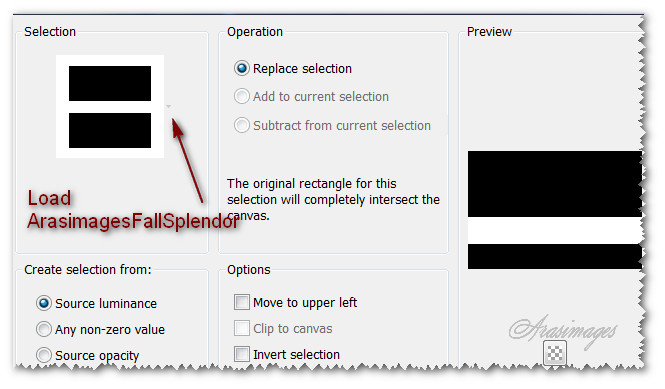 26. Selections/Load/Save Selections/Load Selections from Disk. From the Selection drop down, choose ArasimagesFallSplendor selection. Load.