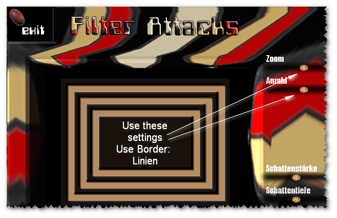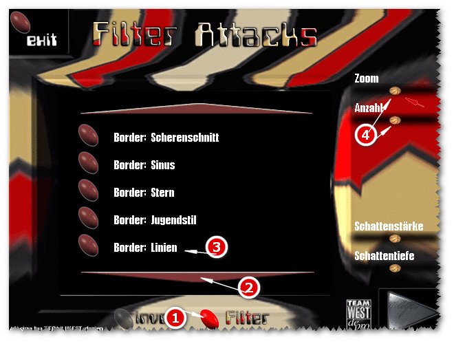 11. Effects/Filter Attacks/Border/Linien. Click on bottom button first, then on narrow down arrow until you find Border: Linien. Click on it to adjust settings.