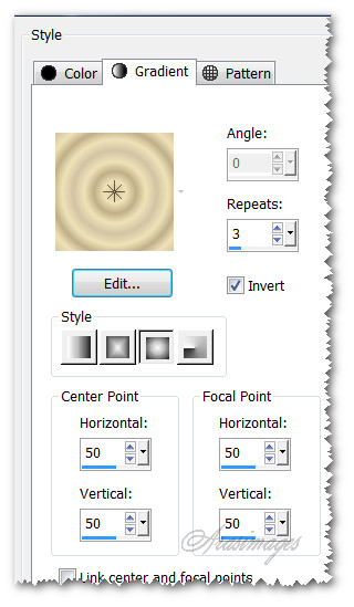 2. Click on Gradient tab in Materials Palette, using drop down to select annesska-a1, Style Sunburst, Angle 0, Repeats 3, Center Point/Focal Point all set to 50, Invert checked.
