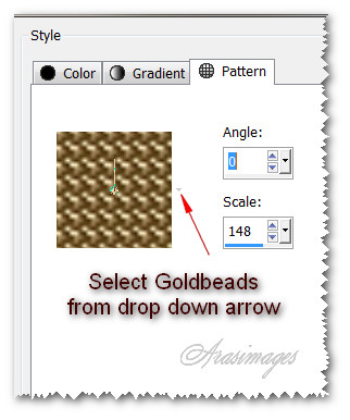 23. In Materials Palette, set Tab to Pattern/goldbeads. Set Scale to 148.