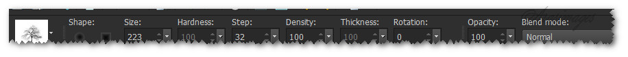 38. From Tool bar, select the Paint Brush tool. Find Lone Tree brush and set to Size 223. See settings below.