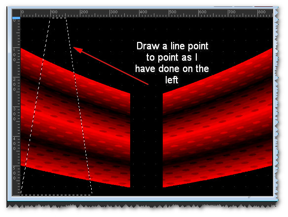 15. Using Selections tool/Freehand Selection, Feather 0, draw a line using Point to Point, starting from 100px at the top, down to bottom left corner, over to 240px, upwards to 150px and back to 100px at beginning. Left click at each intersection and close when you are back at the beginning with right click