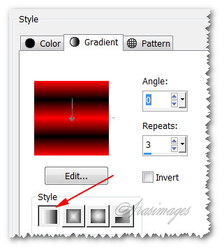 2. In Materials Palette, set to Gradient, Style Linear, Angle 0, Repeats 3, Invert unchecked. Center point: Horizontal/Vertical grayed out.