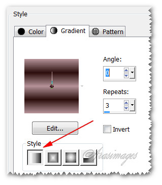 2. In Materials Palette, set to Gradient, Style Linear, Angle 0, Repeats 3, Invert unchecked. Center/Focal points: Horizontal/Vertical grayed out.