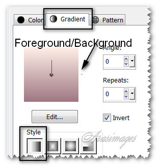 8. In Materials Palette change background color to #9e772. Set to Gradient, Style Linear, Repeats 0, Angle 0, Invert checked. Center and Focal Points not relavent.
