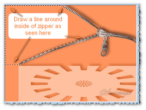 16. Using Selections tool, Freehand Selection/Point to Point/Feather set to 3, draw a line from inside top of zipper, along zipper pull, along bottom edge of zipper and including the rest of the upper left corner as seen below.