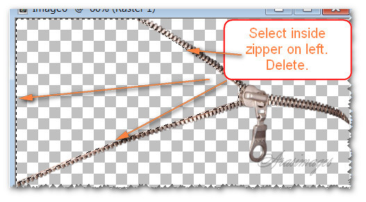 11. Using the Selection tool, Point to Point, Add (Shift), Feather 3, Smoothing 3, draw a line around the zipper inside on left. Delete. Deselect.
