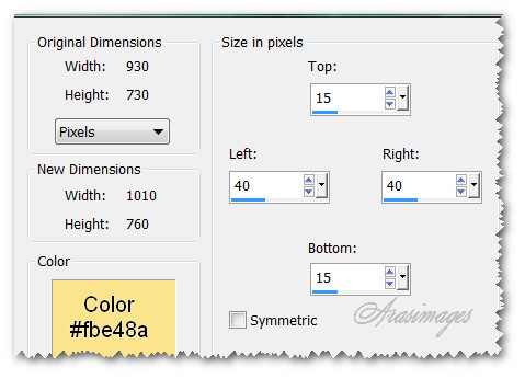 21. Image/Add Borders/Add 40px borders to sides, 15px borders to top and bottom, Symmetric unchecked, color #fbe48a.