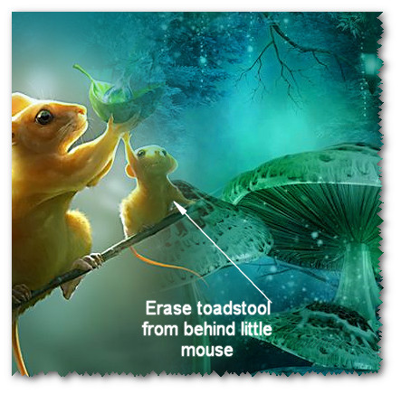 15. Highlight Raster 2 of right side toadstool. Using Eraser tool set to Size 18, erase toadstool from behind little mouse.