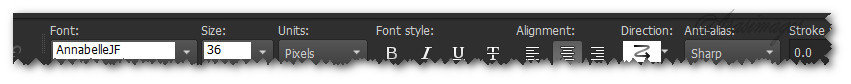 17. From Tool bar, select Text tool. Find the Font AnnabelleJF. Set it to Size 36, Stroke width at 0.0, Line style Solid, Kerning -25.