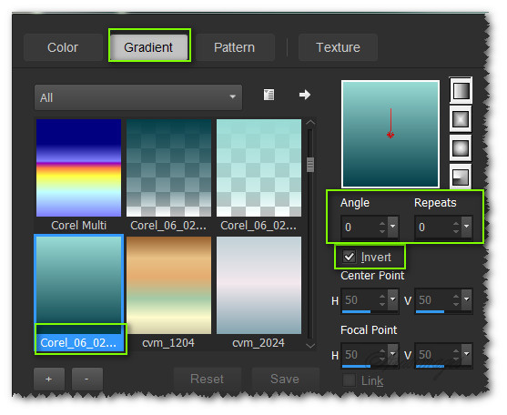 1. In Materials Palette, set Foreground to #98dad4, Background to #053f49. Create a Gradient using these colors, Gradient Corel_06_029 (foreground/background), Style Linear, Angle 0, Repeats 0, Invert checked, Center Points/ Focal Points default.